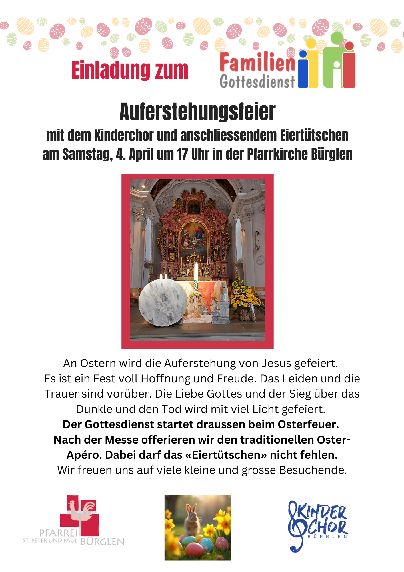 17.00 Uhr Familiengottesdienst, anschl. Apero vor dem Haupteingang